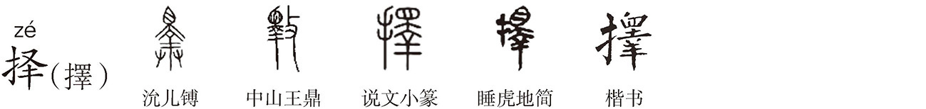 “择”繁体作“擇”,形声字。《说文》:“擇,柬选也,从手睪声。”本指拣选。《仪礼·士昏礼》:“吾子有命,且以备数而择之,某不敢辞。”段注:“柬者,分别䉍之也。……《韵会》作拣,乃是俗字。”睪yì,《说文》:“司视也,从横目,从幸。令吏将目捕罪人也。”“睪”为官吏率眼目(罒)伺机引捕罪人(幸),有分辨、侦查义。拣选需用手,且必仔细分辨以判其虚实好坏,故“擇”从手睪声。“擇”金文作