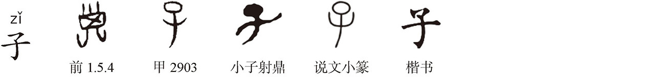 ,籀文子,囟有发,臂胫在几上也。”本为婴孩形,古代指儿、女,今专指儿子。周历以十二地支之首“子”为正月,相当于夏历十一月,“冬至一阳生”,此时“阳气动,万物滋”,与人生子同。张舜徽《约注》:“推原造字之初,子本象小儿之形,因引申为人之通偁。盖子之言兹也,若草木之兹生不已也,故己之所生亦偁子。”“子”甲骨文作
