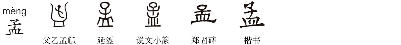 ,古文孟。”兄弟姊妹排行中最大的通称“孟”,而嫡长子又称“伯”。《白虎通》:“嫡长称伯,庶长称孟。”《左传·隐公元年》:“惠公元妃孟子。”孔颖达疏:“孟、仲、叔、季,兄弟姊妹长幼之别字也。孟、伯俱长也。”“孟”通指子女最长者,“皿”用为祭器,《说文》“血,祭所荐牲血也”,“血”所从之“皿”即祭器。古代实行宗法制嫡长子继承权制度,长子为祭祀时以器皿主祭之人,故“孟”从子皿声。“孟”《说文》古文作