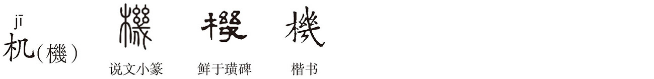 “机”繁体作“機”,形声字。《说文》:“機,主发谓之機,从木幾声。”本指古代弩上的发动机关。沈涛《古本考》:“《一切经音义》卷七:机,主发之机也。”《说文》:“幾,微也,殆也。从