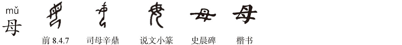 合体象形字。《说文》:“母,牧也,从女,象褱子形。一曰象乳子也。”本指母亲。《诗·邶风·日月》:“父兮母兮,畜我不卒。”段注:“牧者,养牛人也,以譬人之乳子。引伸之,凡能生之以启后者皆曰母。”“母、牡”二字声同韵近,为声训。“母”甲骨文作