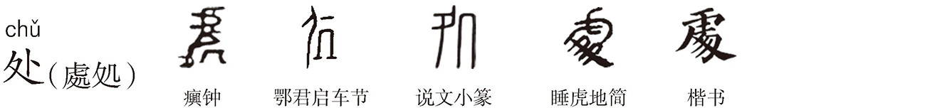 ,从人凭几,省“虍”声。“处(処)、居(凥)”义同,战国文字同形,皆为“處”之省体。具体而言,“居(凥)”的词义侧重于动态,如居住;“处”的词义侧重于静态,如独处。