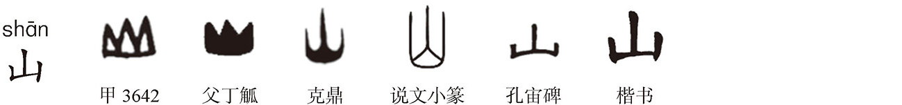 象形字。《说文》:“山,宣也。宣气散,生万物,有石而高。象形。”指山,地面上由土石构成的隆起部分。“山、宣”叠韵,为声训。徐灏《注笺》:“《艺文类聚》引《春秋说题辞》曰:山之为言宣也,含泽布气,调于百神者也。”山能宣发地气,散布四方,故训“宣”;山地广大,物产丰富,能够产生动物、植物、矿物,故训“生万物”;“有石而高”指山之构成及外形。甲骨文作 ,以三个山峰并立表示群山相连。