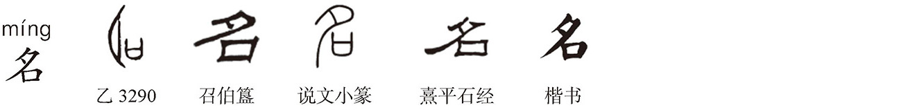 会意字。《说文》:“名,自命也,从口从夕。夕者,冥也。冥不相见,故以口自名。”本自称己名,故训“自命”,为动词。名、命声近韵同,为声训。张舜徽《约注》:“许君云‘自命’者,谓自呼其名也。……自命谓之名,犹鸟声谓之鸣,语原同也。”人在夜晚(夕)相见,彼此看不清对方,需各报己名(口)使对方知晓,故“名”从口从夕。泛称他人亦为名,作名词。