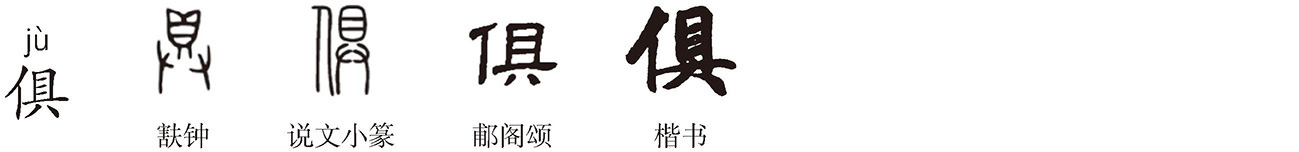 形声字。《说文》:“俱,偕也,从人具声。”俱本指共同,《庄子·天运》:“道可载而与之俱也。”王筠《说文句读》:“偕、俱互训,而皆亦训俱,所以见偕、俱即皆、具之分别文。”俱古字作具。《说文》:“具,共置也。从廾,从貝省。”甲骨文“具”作 ,从廾持鼎,会供置酒食之意。戴侗《六书故·工事四》:“具,张中医文作 ,膳餐之馔具也,从鼎省从廾。凡飨食之礼,羹定则实诸鼎,乃告具。故凡馔具皆曰具。……引而申之,凡备具者皆曰具。”鼎、貝二字在古金文中易混用,从鼎之字后多从貝。供置酒食需精心筹备、面面俱到,具转指完备、齐备。也指共同,相与共事谋求周全,故“俱”从人具声。