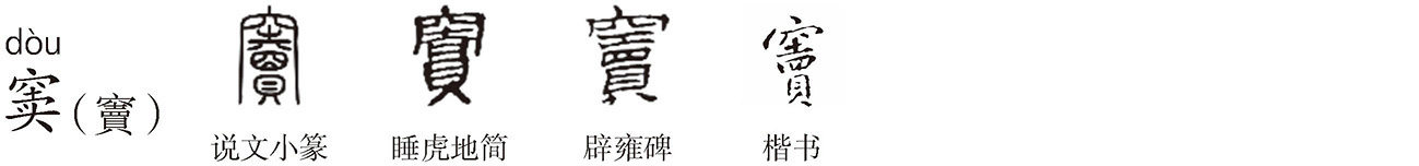 “窦”繁体作“竇”,形声字。《说文》:“竇,空也,从穴,瀆省声。”本指水沟、水道口。徐锴《系传》:“水沟口也。”段注:“空孔古今语,凡孔皆谓之竇。”“瀆”指沟渠,段注:“凡水所行之孔曰瀆。”《字汇·水部》:“瀆,与竇同。”竇、瀆均从 声, yù,《说文》:“衒也,从貝 声。 ,古文睦,读若育。”衒是沿街叫卖,“ ”即“賣”,也作“ ”。 mù,透过窗(囧)往上( )看清,同“睦”,有通透、亲切义。“ ”从貝 声,買賣(貝)双方交易透明( )。“ ”用同“賣”,竇为中空通水之沟渠,故“竇”从穴賣( )声,或从穴瀆省声。
