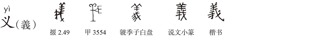 “义”繁体作“義”,形声字。《说文》:“義,己之威儀也,从我、羊。 ,墨翟书義从弗。魏郡有羛阳乡,读若锜。”本指仪表、威仪,后作“儀”。段注:“古者威儀字作義,今仁義字用之。”甲骨文“羊”作 ,以祭祀的羊头代全羊,羊表吉祥美善义。仪表、威仪庄重则体现美善(羊),段注:“威仪出于己,故从我。……从羊者,与善美同意。”故“義”从我羊。“義”甲骨文作 ,或谓“義”当为仪仗队员手执兵器(我)戴羊头装饰(羊)之形。墨翟书即今传《墨子》,“義”作“羛”,下部构件“弗”乃“我”之讹变,战国文字“義”所从之“我”或作 ,与“弗”字形近。简化字音借乂加丶作“义”。