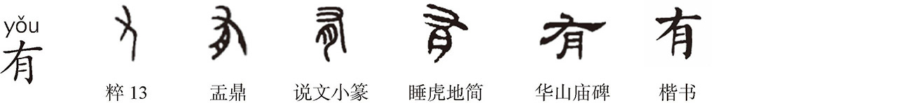 形声字。《说文》:“有,不宜有也。《春秋传》曰‘日月有食之’。从月又声。”指不当有而有。古以日蚀月蚀为不祥之兆,故言“不宜有”,此许慎本其师贾逵之说。“有”甲骨文只用手( ),“又—有”通用。金文作 ,以手(又)持肉(月)形。徐灏《注笺》:“或曰从肉,古者未知稼穑,食鸟兽之肉,故从又持肉为有也。”张舜徽《约注》:“上世田猎,食肉衣皮。持肉为有,犹持皮为求耳。田猎而得肉,乃常有之事,故有字复含再义、又义。古又、有通用。”小篆“月”与“肉”作偏旁都作 ,从月旁的“肝胆肺脾肥胖”都与肉相关。以手持肉为有,故“有”从肉(月)又声。