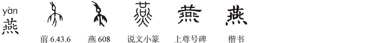 象形字。《说文》:“燕,玄鸟也,籋口,布翄,枝尾,象形。”本为鸟纲燕科各种类的通称。《楚辞·离骚》王逸注:“玄鸟,燕也。”燕子为浅黑色候鸟,故名玄鸟,原始先民以为图腾,《诗·商颂·玄鸟》:“天命玄鸟,降而生商,宅殷土茫茫。”毛传:“春分玄鸟降,汤之先祖有娀氏女简狄配高辛氏帝,帝率与之祈于郊禖而生契。”燕、 一物,皆以声命名,同训“玄鸟”,戴侗《六书故》:“燕、 皆因其声而命之,玄则以其色也。”“燕”甲骨文作 ,象燕子口中衔物而张翼翅尾之形;小篆作 ,上“廿”似燕小钳之口,中 象身背,身背旁之“北”象展两翅之形,下“火”象歧尾之形。
