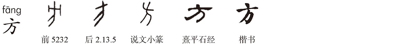 象形字。《说文》:“方,并船也,象两舟省、总头形。 ,方或从水。”指头相并的两条独木舟。“方”小篆作 ,王筠《句读》:“ 象两舟省,两故并也。 在其上,是总摄其头也。”舟行于水,故或体从水作“汸”。甲骨文作 ,徐中舒认为象耒的形制,上短横象柄首横木,下长横为足踩踏处,旁两短画或为装饰,古代持耒耕作,二人并耕,故方有并意。张舜徽《约注》:“推之二人密近为比,或为竝,或为㚘,二骨相连为骿,二马同驾为骈,俱语声之转,其义近也。凡言比方,乃引申义。方圆则借为匚,方闻借为旁,四方借为傍,借义行而本义废矣。”