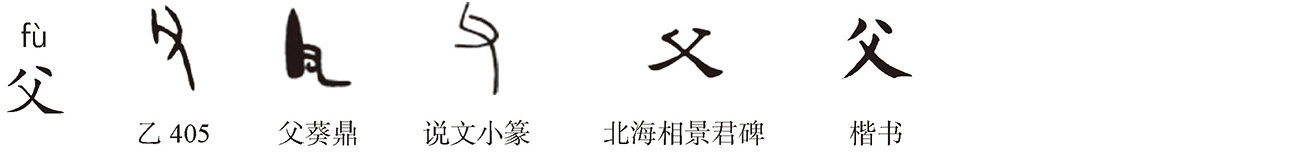 会意字。《说文》:“父,矩也,家长率教者。从又举杖。”指父亲。父亲为一家之长,以身示范,依法度教子,为规矩的象征,故训“矩”。《白虎通》:“父,矩也,以法度教子。”徐锴《系传》:“君子曰:鞭朴不可废于家,刑法不可废于国,家人有严君焉,父母之谓也,故于文又举丨为父。又,手也;丨,杖也。举而威之也。”父掌一家之教,需严而有威,故字形