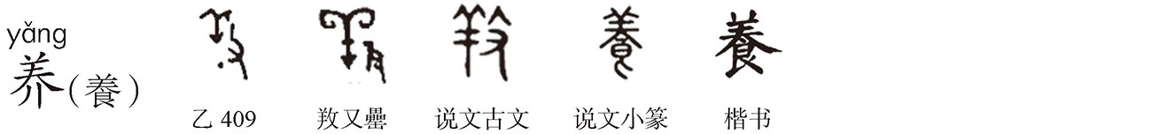 ,古文養。”本指供养、奉养。《玉篇·食部》:“养,具珍羞以供养尊者也。”《论语·为政》:“今之孝者,是谓能养。”供养父母不仅要保证衣食等生活所需,更须恭敬和顺。羊为美味,且性情驯顺,有善美意,故“養”从食羊声。“养”甲骨文作