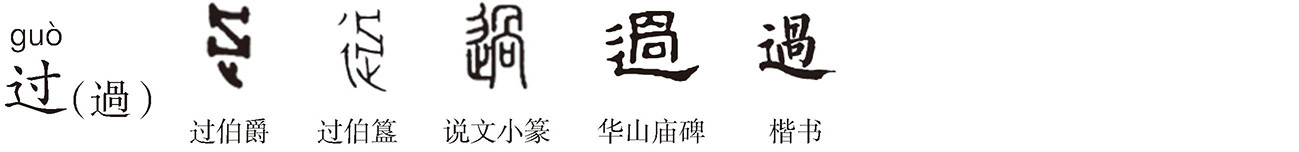“过”繁体为“過”,形声字。《说文》:“過,度也,从辵咼声。”指跨越、经过。《论语·宪问》:“子击磬于卫,有荷篑而过孔氏之门者。”吴善述《广义校订》:“过,本经过之过,故从辵。许训度也,度者过去之谓,故过水曰渡,字亦作度。”咼kuā(今读wāi),《说文》:“口戾不正也,从口冎声。”本义为歪斜。冎ɡuǎ,指剔骨离肉,后作“剐(剮)”,甲骨文作