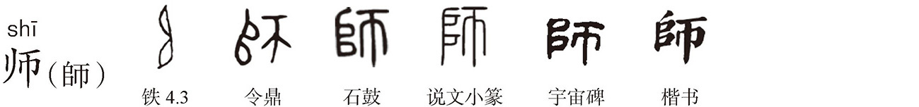 “师”繁体作“師”,会意字。《说文》:“師,二千五百人为師。从帀从