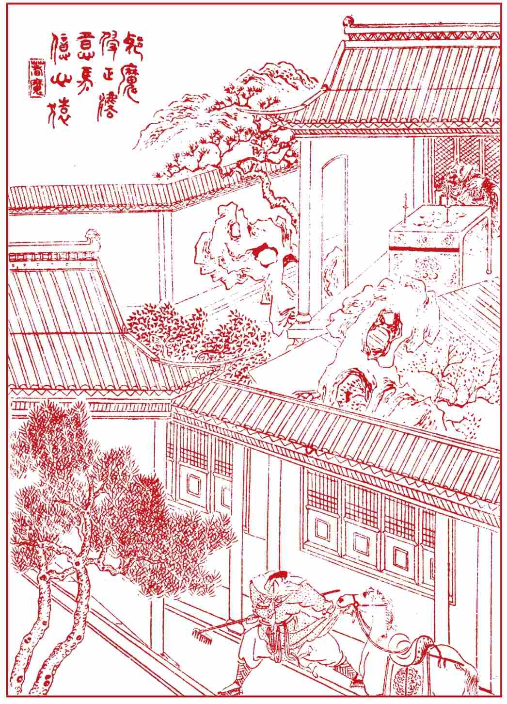 那国王却传旨,教光禄寺大排筵宴,谢驸马救拔之恩;不然,险被那和尚害了。当晚众臣朝散,那妖魔进了银安殿。又选十八个宫娥彩女,吹弹歌舞,劝妖魔饮酒作乐。那怪物独坐上席,左右排列的,都是那艳质娇姿。你看他受用。饮酒至二更时分,醉将上来,忍不住胡为,跳起身大笑一声,现了本相, 果不出浑家所料。 陡发凶心,伸开簸箕大手,把一个弹琵琶的女子,抓将过来,扢咋的把头咬了一口。吓得那十七个宫娥,没命的前后乱跑乱藏。你看那: