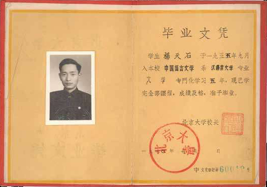 1960 年,杨天石先生凭借优异成绩毕业,随后被分配至地处北京南苑郊区的一所拖拉机手短期培训学校。在那里度过两年时光后,他被调入北京师范大学第一附属中学,前后担任长达十八年的语文教员。