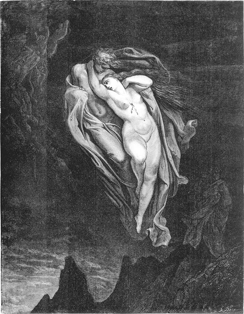 犹如群鹤在空中排成长行,唱着它们的哀歌飞去 [12] ,同样,我看到一些阴魂哀号痛哭着被上述的狂飙卷来;因此我说:“老师,这些受漆黑的空气这样惩罚的,都是什么人哪?”“你想知道情况的那些人之中的第一个,”他随即对我说,“是许多语言不同的民族的女皇帝。她沉溺于淫乱的罪恶那样深,竟然在她的法律中把人人恣意淫乱定为合法,来免除她所遭到的谴责。她是塞米拉密斯 [13] ,据史书记载,她是尼诺的妻子,后来继承了他的帝位,拥有如今苏丹所统治的国土 [14] 。另一个是因为爱情自杀的对希凯斯的骨灰背信失节的女性 [15] ,她后面来的是淫荡的克利奥帕特拉 [16] 。你看那是海伦,为了她,多么漫长的不幸的岁月流转过去 [17] ,你看那是伟大的阿奇琉斯,他最后是同爱情战斗 [18] 。你看那是帕里斯 [19] ,那是特里斯丹 [20] 。”他还把一千多个因为爱情离开人世的人指给我看,并且一一说出他们的名字。我听了我的老师说出古代的贵妇人和骑士们 [21] 的名字以后,怜悯之情抓住了我的心,我几乎神志昏乱了。我开始说:“诗人哪,我愿意同那两个在一起的、似乎那样轻飘飘地乘风而来的灵魂说话。”他对我说:“你注意着他们什么时候离我们近些;那时,你以支配他们的行动的爱的名义恳求他们,他们就会来的。”当风刚把他们刮向我们这里时,我就开始说:“受折磨的灵魂们,过来同我们交谈吧,如果无人禁止的话!”