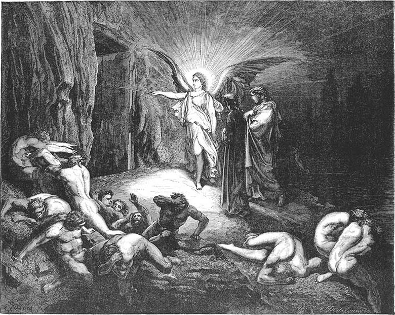 如同群蛙遇到它们的天敌蛇时,纷纷没入水中,各自缩作一团蹲伏在水底一样,我看到一千多个亡魂这样逃避一位步行走过斯提克斯沼泽而不沾湿脚跟者。他时时在面前挥动左手,拨开浓雾;似乎只有这种麻烦使他感到疲倦。我认清他是一位天使,就转身向着老师;老师示意要我肃静,向他鞠躬致敬。啊,看来,他多么愤怒啊!他来到城门前,用一根小杖开了城门,没有遇到任何抵抗。
