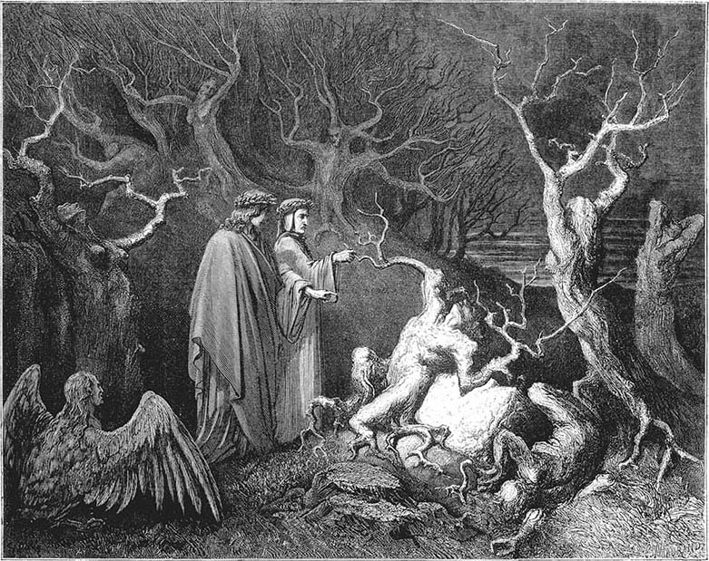 [10] 这段情节受到《埃涅阿斯纪》卷三有关普利阿姆斯最小的儿子波利多鲁斯的故事的启发。但是但丁诗中和维吉尔诗中的共同之处仅在于树说话和流黑血这一点,诗中的整个气氛则是各不相同的。