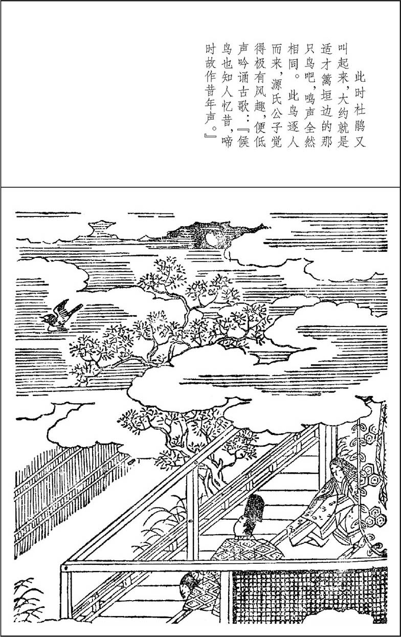 。看到四周一带的风趣,他便忆起这是以前曾经欢度一宵的人家,不禁心动。他想:“阔别多时了,那人还记得我么?”便觉气馁。然而不能过门不入,一时犹豫不决。正在此时,忽闻杜鹃的叫声,似乎在挽留行人,便命回车,照例派惟光进去,传达一首诗: