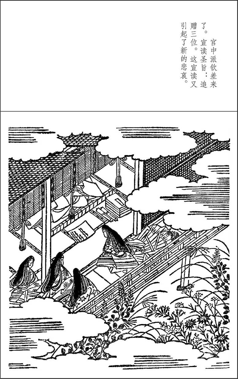 此时小皇子已睡。命妇禀道:“本当拜见小皇子,将详情复奏。但万岁爷专候回音,不便迟归。”急欲告辞。太君道:“近来悼念亡女,心情郁结,苦不堪言。颇思对知己之人罄谈衷曲,俾得略展愁怀。公余之暇,务请常常惠临,不胜盼感。回思年来每次相见,都只为欢庆之事。此次为传递此可悲之书柬而相见,实非所望。都缘妾身命薄,故遭此苦厄也。亡女初诞生时,愚夫妇即寄与厚望,但愿此女为门户增光。亡夫大纳言弥留之际,犹反复叮嘱道:‘此女入宫之愿望,务必实现,切勿因我死而丧失锐气。’我也想到:家无有力之后援人,入宫后势必遭受种种不幸。只因不忍违反遗嘱,故尔令其入宫。岂料入侍之后,荷蒙主上过分宠幸,百般怜惜,无微不至。亡女也不敢不忍受他人种种不近人情之侮辱,而周旋于群妃之间。不料朋辈妒恨之心,日积月累,痛心之事,难于尽述。忧能伤人,终于惨遭夭死。昔日之深恩重爱,反成了怨恨之由。——唉,这原不过是我这伤心寡母的胡言乱道而已。”太君话未说完,一阵心酸,泣不成声。此时已到深夜了。