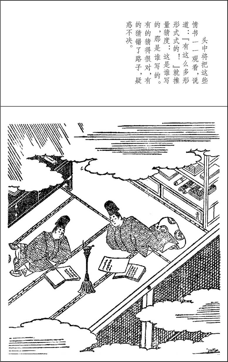 一日,下了整天的雨,黄昏犹自不停。雨夜异常岑寂,在殿上侍候的人不多;淑景舍比平日更为闲静。移灯近案,正在披览图书,头中将从近旁的书橱中取出用各种彩色纸写的情书一束,正想随手打开来看,源氏公子说:“这里面有些是看不得的,让我把无关紧要的给你看吧。”头中将听了这句话很不高兴,回答说:“我正想看不足为外人道的心里话呢。普通一般的情书,像我们这种无名小子也能收到许多。我所要看的,是怨恨男子薄情的种种词句,或者密约男子幽会的书信等。这些才有看的价值呢。”源氏公子就准许他看了。其实,特别重要而必须隐藏的情书,不会随便放在这个显露的书橱里,一定深藏在秘密地方。放在这里的,都是些次等的无足重轻的东西。头中将把这些情书一一观看,说道:“有这么多形形式式的!”就推量猜度:这是谁写的,那是谁写的。有的猜得很对,有的猜错了路子,疑惑不决。源氏公子心中好笑,并不多作解答,只是敷衍搪塞,把信收藏起来。随后说道:“这种东西,你那里一定很多吧。我倒想看些。如果你给我看了,我情愿把整个书橱打开来给你看。”头中将说:“我的,恐怕你看不上眼吧。”说过之后,他就发表他的感想: