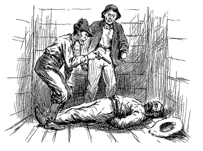 有一回他说:“听他央求吧!要不是咱们收拾了他,把他捆上了,他早就把咱们俩都弄死了。到底为了什么呢?无缘无故。就因为咱们要应得的那一份儿——就是为了那个。可是我敢说你再也别想吓唬谁了,吉姆·特纳。把手枪 起来吧,毕尔。”