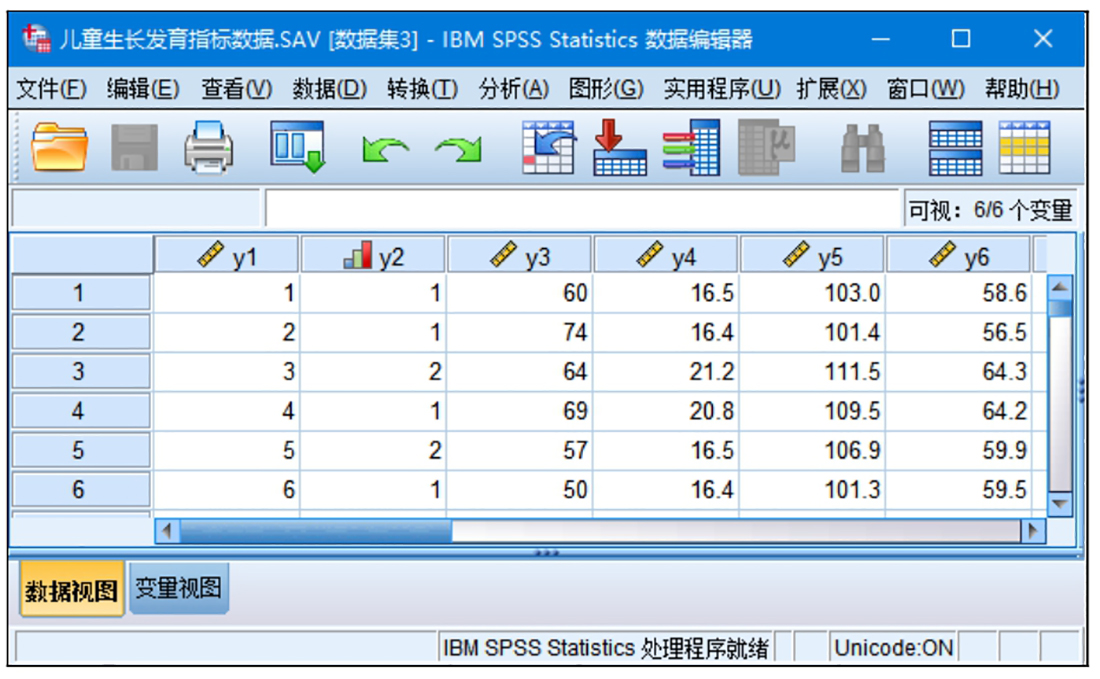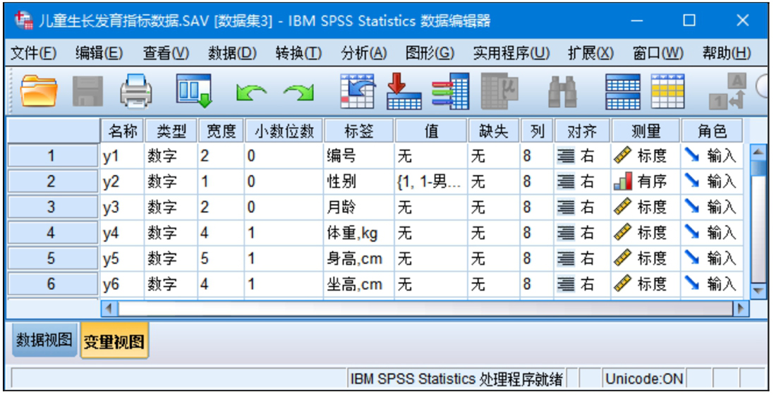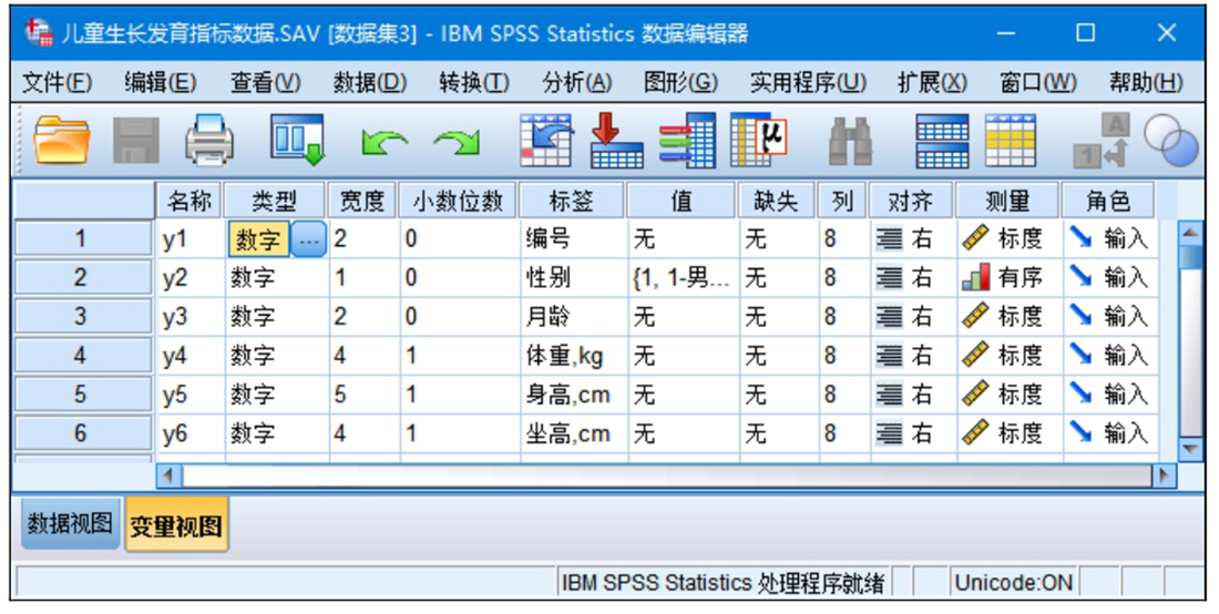 以“儿童生长发育指标数据”为例,数据编辑器的数据视图如图1.18所示,其中每一行表示一个样本观测值,每一列表示一个变量。