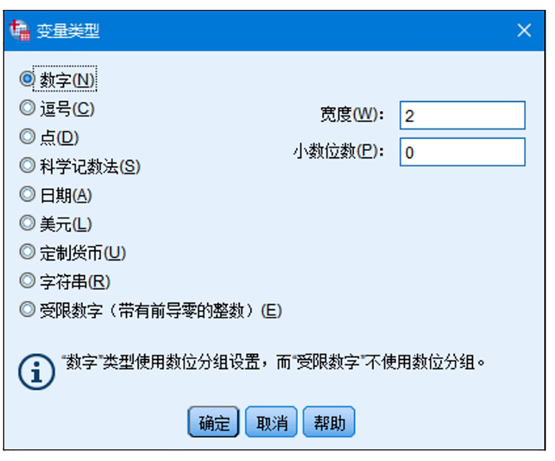 SPSS可以设置9种变量类型,分别是:数字、逗号、点、科学记数法、日期、美元、定制货币、字符串和受限数字(带有前导零的整数)。这9种变量类型可归为3类:数值型变量、日期型变量和字符型变量。