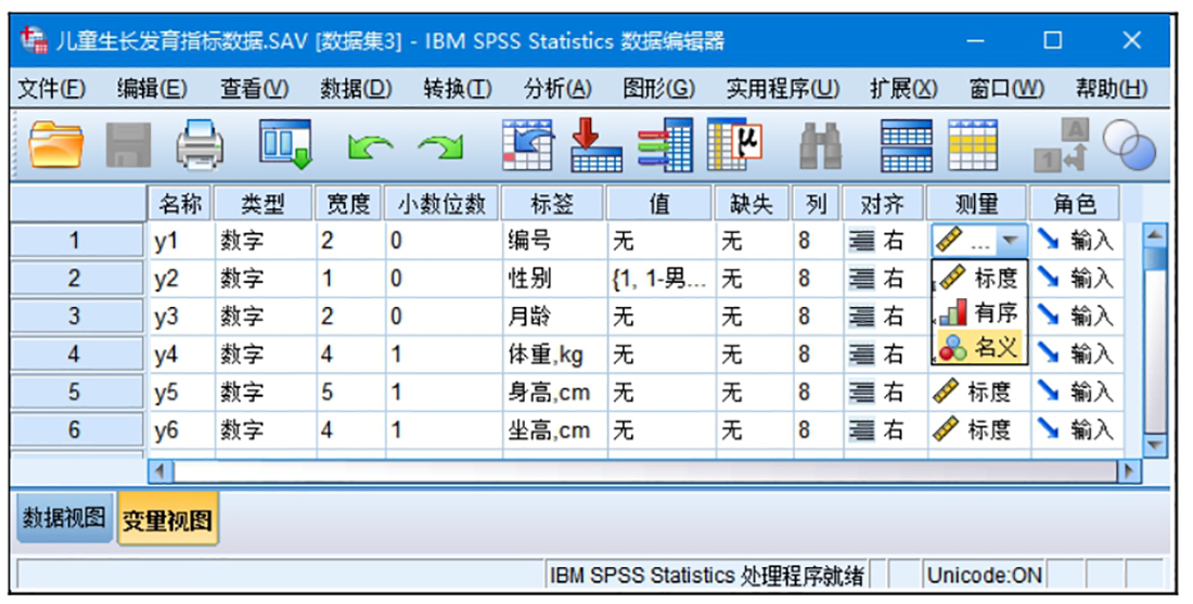 简单来说,“标度”表示连续变量,“名义”表示分类变量,“有序”表示具有顺序性质的分类变量。用户需要根据变量的实际特征来指定测量类型。例如,针对学生的身高、体重等连续性变量,应将测量方式设置为“标度”;针对学生衣服的颜色变量,可以考虑将测量方式设置为“名义”;针对银行的信贷资产(正常、关注、次级、可疑、损失)或客户满意程度(很满意、比较满意、基本满意、不满意、很不满意等),则应选择“有序”。