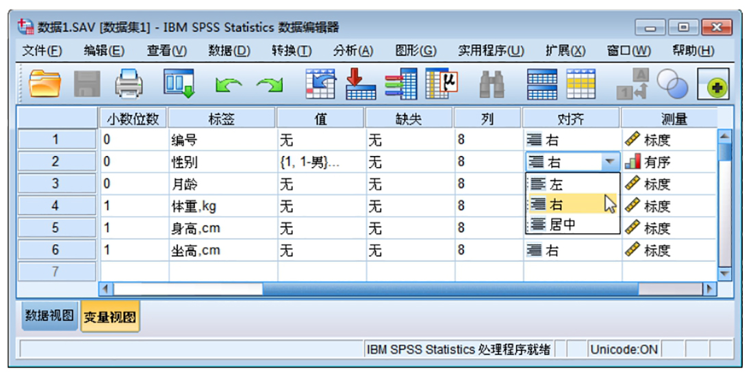 在SPSS变量视图中,变量值在单元格中的显示方式有“左”对齐、“右”对齐和“居中”3种,如图1.24所示。用户可以通过在“对齐”列中选择“左”“右”或者“居中”来决定对齐方式。默认情况下,数值型变量的对齐方式为右对齐,字符型变量的对齐方式为左对齐。