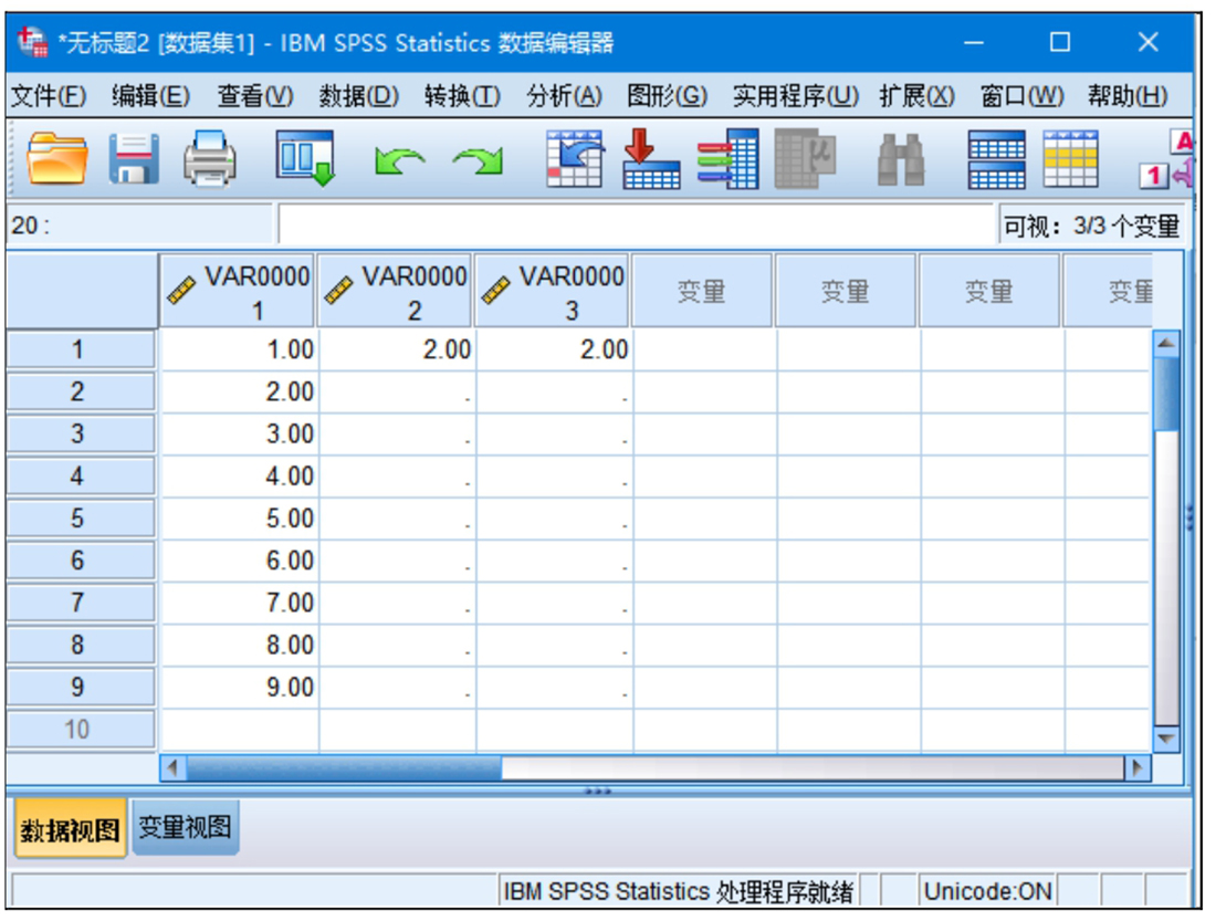 并不一定需要先设定变量再录入数据。如果用户没有设定变量,而是直接在数据视图中录入数据,SPSS会自动使用系统默认名称(VAR00001、VAR00002、VAR00003等)创建变量,如图1.26所示。