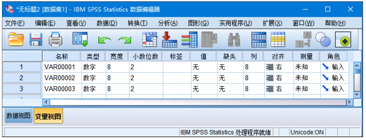 数据编辑器的变量视图如图1.19所示,其中每一行表示一个变量,每一列表示变量的一个属性。