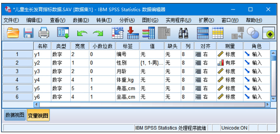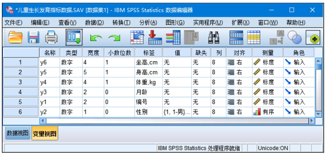 在整理数据资料或者查看分析结果时,如果变量很多,我们有时可能需要将变量值按照变量的某一属性的大小进行升序或降序排列。例如,我们想观察有哪些变量是名义变量或有序变量,有哪些变量进行了变量标签操作或值标签操作等。下面以本章附带的“儿童生长发育指标数据”为例,介绍如何按照变量的测量方式进行降序排列。操作步骤如下: