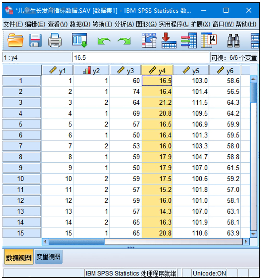 在整理数据资料或查看分析结果时,我们通常希望样本观测值按照某一变量的大小进行升序或者降序排列。例如,我们想按照学生的学习成绩进行排序,或按照销售额的大小对各个便利店进行排序等。下面以本章附带的“儿童生长发育指标数据”为例,介绍如何根据y4(体重)变量进行降序排列。操作步骤如下: