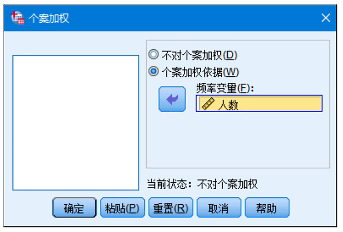 加权前的数据文件如图2.62所示。在菜单栏中选择“数据|个案加权”命令,打开“个案加权”对话框,如图2.63所示。其中,“不对个案加权”表示当前数据集不进行加权,该项一般用于取消对已加权数据集的加权;“个案加权系数”表示对当前数据集进行加权,同时激活“频率变量”列表框。频率变量用于定制权重,本例中选择“人数”变量作为加权频率变量。单击“确定”按钮,即可执行加权操作。