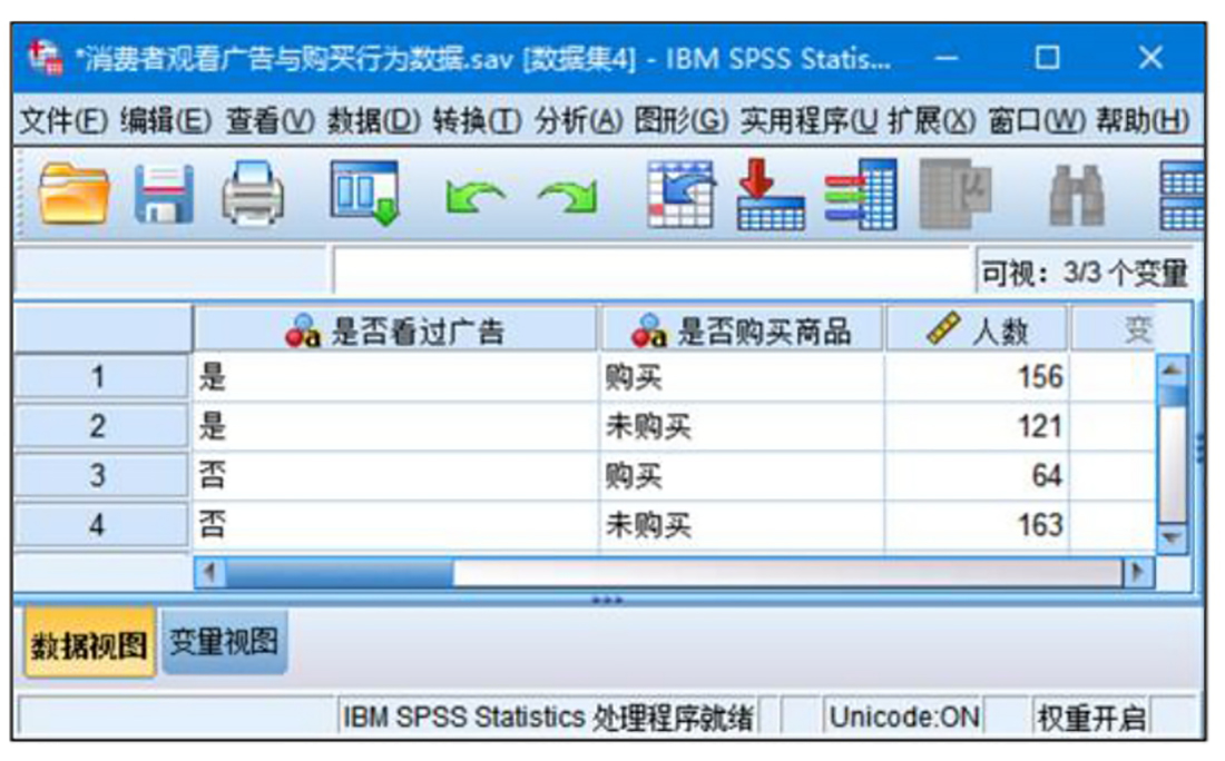 对数据进行加权处理是我们使用SPSS提供的某些分析方法的重要前提。对数据进行加权后,当前的权重将被保存在数据中。当进行相应的分析时,用户无须再次进行加权操作。本节以对广告的效果观测为例,讲解数据的加权操作。本例将给出消费者的购买行为与是否看过广告之间的联系,按“是否看过广告”和“是否购买商品”两个标准,消费者被分为4类,研究者对这4类消费者分别进行调查。由于不同情况下调查的人数不同,如果将4种情况等同进行分析,势必由于不同情况下的观测数目不同而导致分析出现偏误,因此我们需要对观测量进行加权。操作步骤如下:
