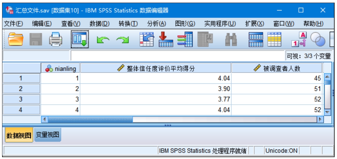单击“确定”按钮,按年龄汇总后的新数据文件“汇总文件”如图2.80所示。SPSS分别给出了各个年龄段的“整体信任度评价平均得分”和“被调查者人数”,并作为新变量保存在数据文件中。