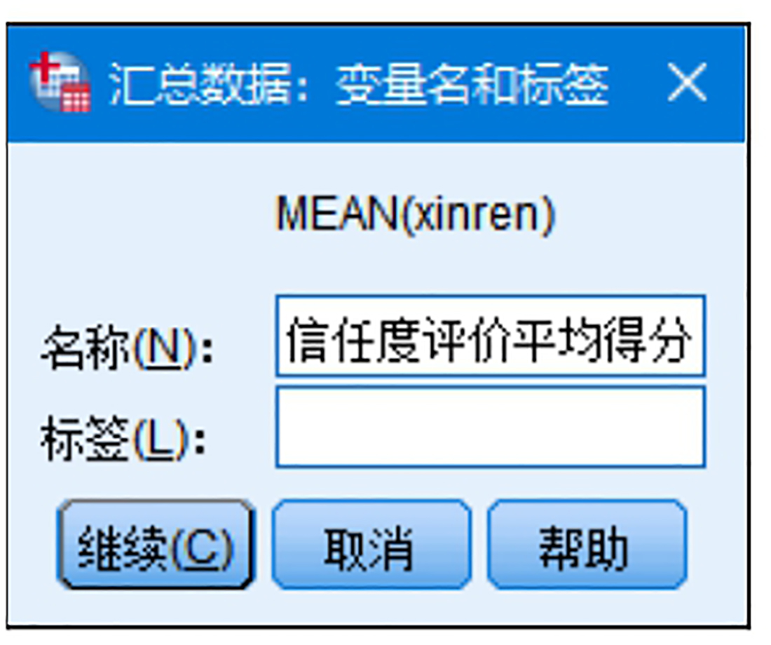 设置汇总变量。在“变量摘要”列表框中选中汇总变量,单击“函数”按钮,在弹出的“汇总数据:汇总函数”对话框(见图2.78)中选择汇总函数的类型。本例要输出整体信任度评价变量的平均值,所以采用系统默认的“平均值”即可。单击“名称与标签”按钮,在弹出的“汇总数据:变量名和标签”对话框(见图2.79)中设置汇总后产生的新变量的变量名与变量标签。本例要输出整体信任度评价变量的平均值,所以命名为“整体信任度评价平均得分”。