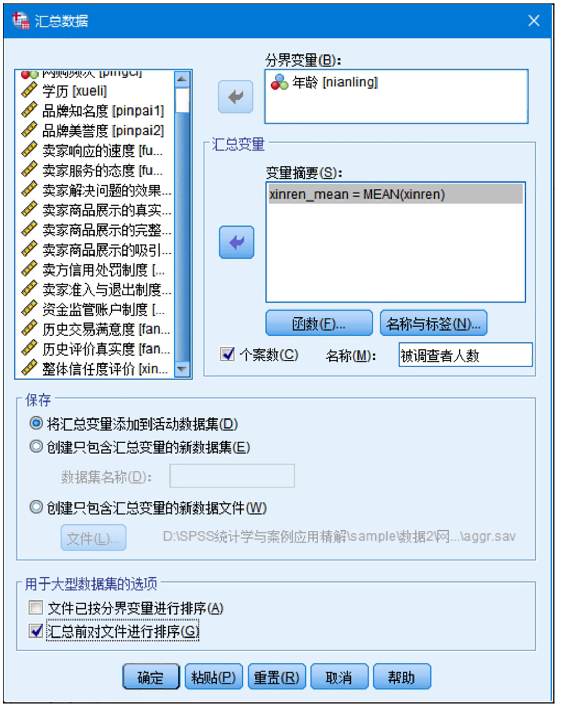 选中“将汇总变量添加到活动数据集”单选按钮,系统会将汇总的结果保存到当前数据集。
