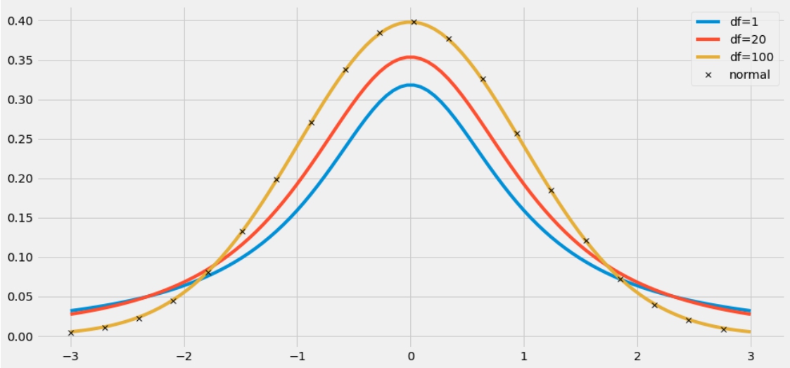 图3.3 不同自由度下,T分布与标准正态分布的比较