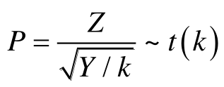 T分布(学生T-分布,T-distribution)通常用于根据小样本估计正态分布且方差未知的总体均值,如果总体方差已知(例如在样本数量足够多时),则应该用正态分布来估计总体均值。如果随机变量Z服从均值为0、标准差为1的标准正态分布 N (0,1),而随机变量Y服从自由度为 k 的卡方分布,且随机变量Z和随机变量Y相互独立,那随机变量 P 服从自由度为 k 的T分布: