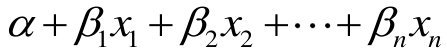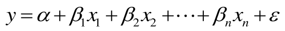 其中, y 为因变量(也称被解释变量、被影响变量),各个 x i 为自变量(也称因子、解释变量、影响变量), α 为截距项,各个 β i 为待估计参数, ε 为误差项。例如,在针对一项关于“某地区劳动人口中年龄、学历、受教育程度、工作年限等因素对年收入水平的影响”的研究中, y 为“年收入水平”,各个 x i 为“年龄、学历、受教育程度、工作年限等”等因素,各个 β i 的正负号及大小反映了这些因素对年收入水平的影响方向和影响程度。