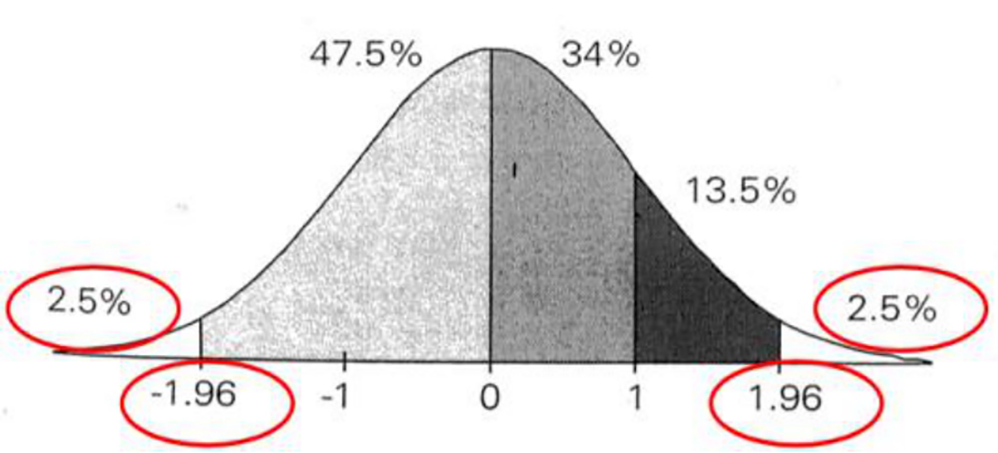 置信区间主要用于假设检验,划定置信区间的两端数值分别称为置信下限(Lower Confidence Limit,LCL)和置信上限(Upper Confidence Limit,UCL)。95%的置信区间示例如图3.4所示。