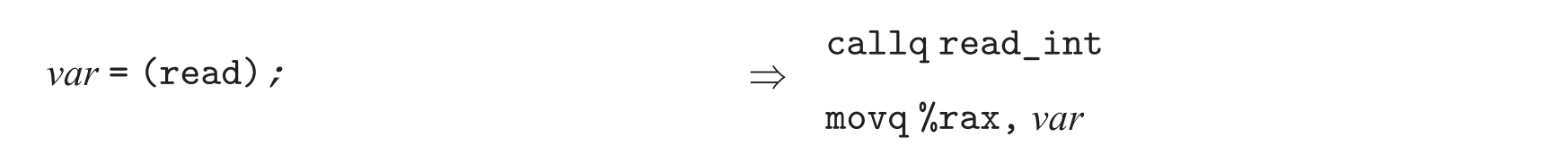 在x86汇编中没有直接对应的read操作,因此我们在用C编写的文件runtime. c(Kernighan and Ritchie 1988)中通过read_int函数来提供该功能。通常,我们将此文件中的所有功能称为 运行时系统 ,或者简称为 运行时 。在编译生成的x86汇编代码时,需要将runtime.c编译为runtime.o(这是一个 目标文件 ,使用gcc编译时带有选项-c),并将其链接到可执行文件中。为了完成代码生成,所需要做的就是将read赋值转换为对read_int函数的调用,然后将值从rax传送到左侧变量。(回想一下,函数的返回值放在rax中)。