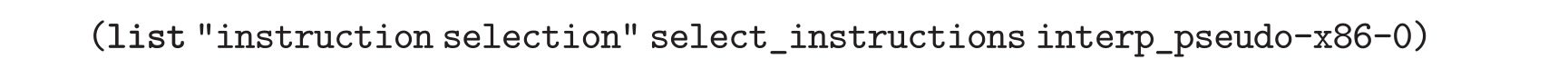 习题2.5 实现在compiler.rkt中的select_instructions编译遍。创建三个新的示例程序,用于练习本编译遍中所有有趣的案例。在run-tests.rkt脚本中,将以下条目添加到编译遍的列表中,然后运行该脚本以测试编译器。