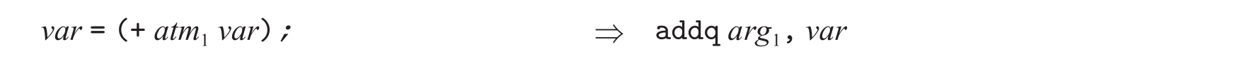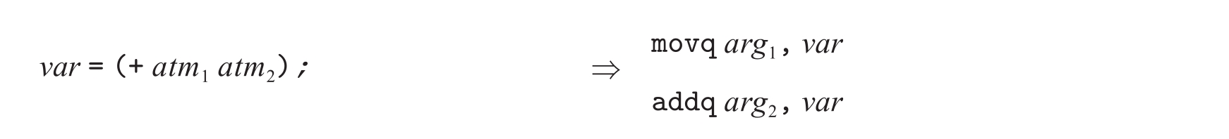 接下来考虑 stmt 非终结符的情况,先从算术运算开始。例如,考虑下面左边的加法操作。在x86中有一个addq指令,但是它的执行方式是就地更新。所以,我们可以把 arg 1 移到左边的变量中然后把 arg 2 加到 var 中, arg 1 和 arg 2 分别是 atm 1 和 atm 2 对应的转换结果: