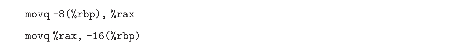 第二个movq指令是有问题的,因为两个参数都是栈位置。建议通过从原栈位置传送到寄存器rax,然后从rax传送到目标位置来解决此问题,如下所示。