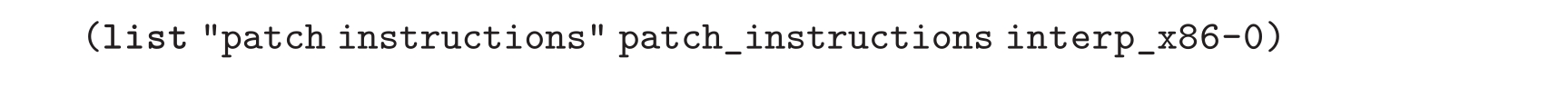 习题2.7 在compiler.rkt中实现patch_instructions编译遍。创建三个新的示例程序,用于练习本节中所有此遍的有趣案例。在run-tests.rkt脚本中,将以下条目添加到编译遍列表中,然后运行该脚本以测试编译器: