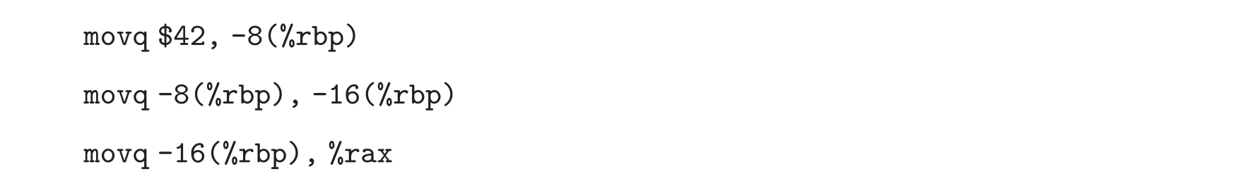 patch_instructions遍将编译器从x86 Var 语言翻译到x86 Int 语言,确保每条指令都遵守一条指令最多只能有一个参数会内存引用的限制。